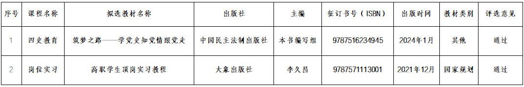 本次教材选用历经教研室初选、院部审查、学院教材建设指导委员会审议三级审核流程,现将2025-2026学年第二学期教材选用结果予以公示(详见附件)。