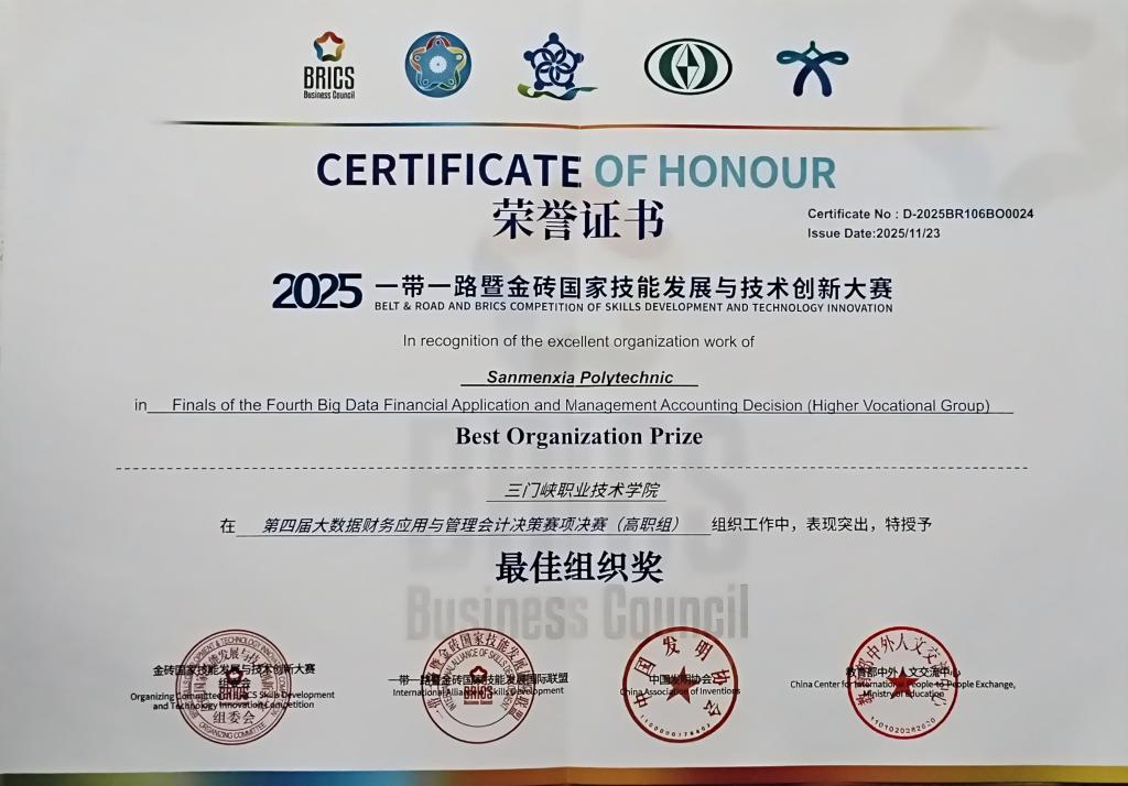 近日,2025年一带一路暨金砖国家技能发展与技术创新大赛之第四届大数据财务应用与管理会计决策赛项全国总决赛圆满落幕。我院数字经济与管理学院大数据与会计专业学生王梦蝶、陈珂帆、谭湘宁、周永鑫,在教师杨杰、吕帆的精心指导下,凭借扎实的专业能力和良好的团队协作,从全国1950余支参赛队伍中脱颖而出,以北区第十九名晋级全国总决赛,并最终以全国第九名的优异成绩荣获一等奖。学院同时获评全国“最佳组织奖”,展现出在大数据财务与管理会计融合育人方面的扎实成效。