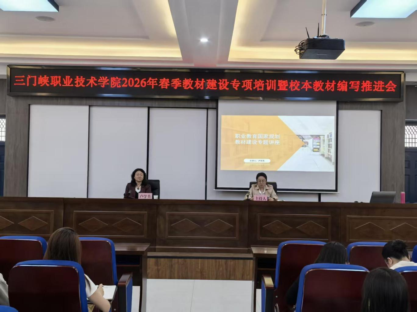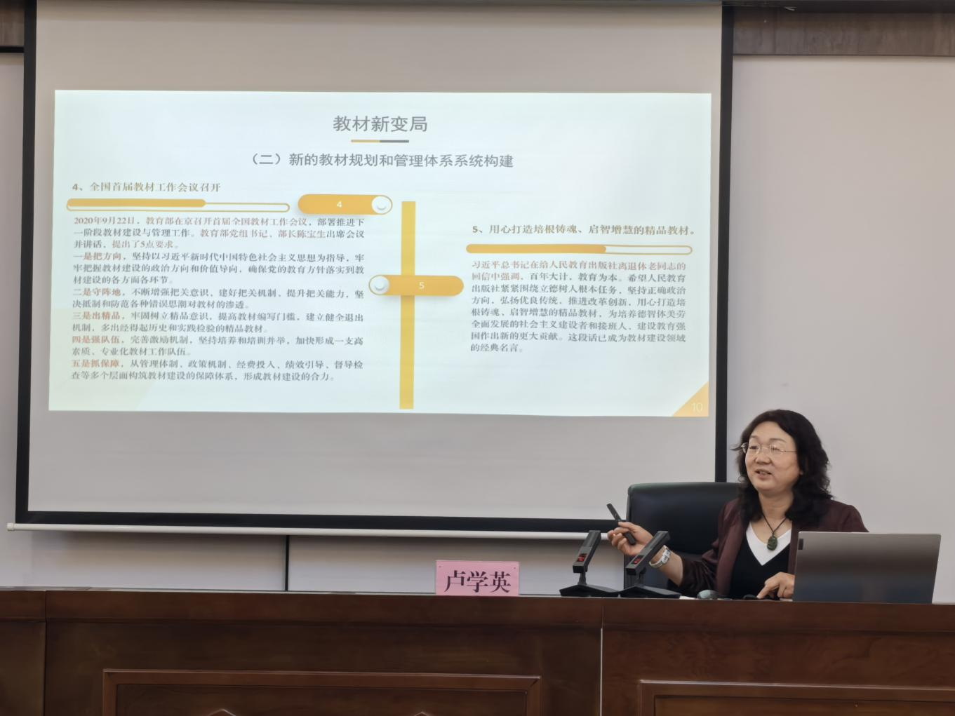 当日下午,教材建设专项培训暨校本教材编写推进会在校本部1106会议室召开。本次培训特邀北京出版集团教材中心主任卢学英教授开展专题讲座。各院部教学副院长、教学科研办公室主任、校本教材项目负责人及编写团队成员参会。会议由教务处副处长邢爱英主持。